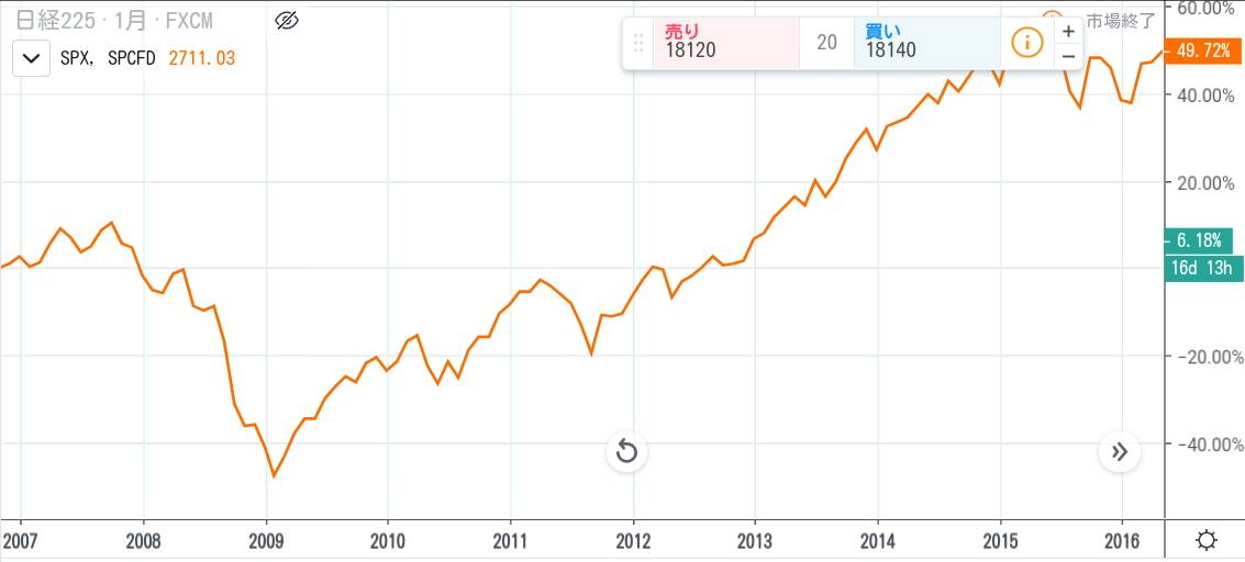 上のチャートは、リーマンショックより少し前の2007年〜2016年までのS&P500の値動きです。