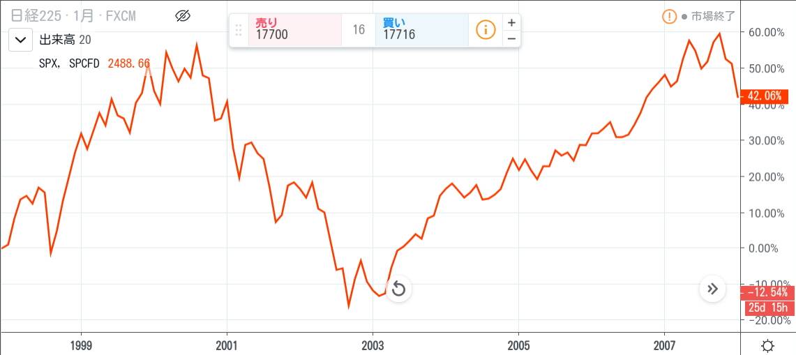 こちらもS&P500のチャートです。バブルピーク時から暴落後の最安値までにかかった期間は2年、下落率は約50%です。