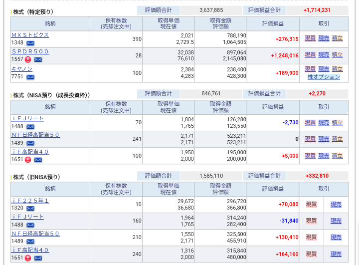 現行NISAを見ると、Jリート(1488)は前回とほぼ変わらず、日経高配当50(1489)はプラマイゼロに、トピックス高配当40(1651)は、やや下がりです。