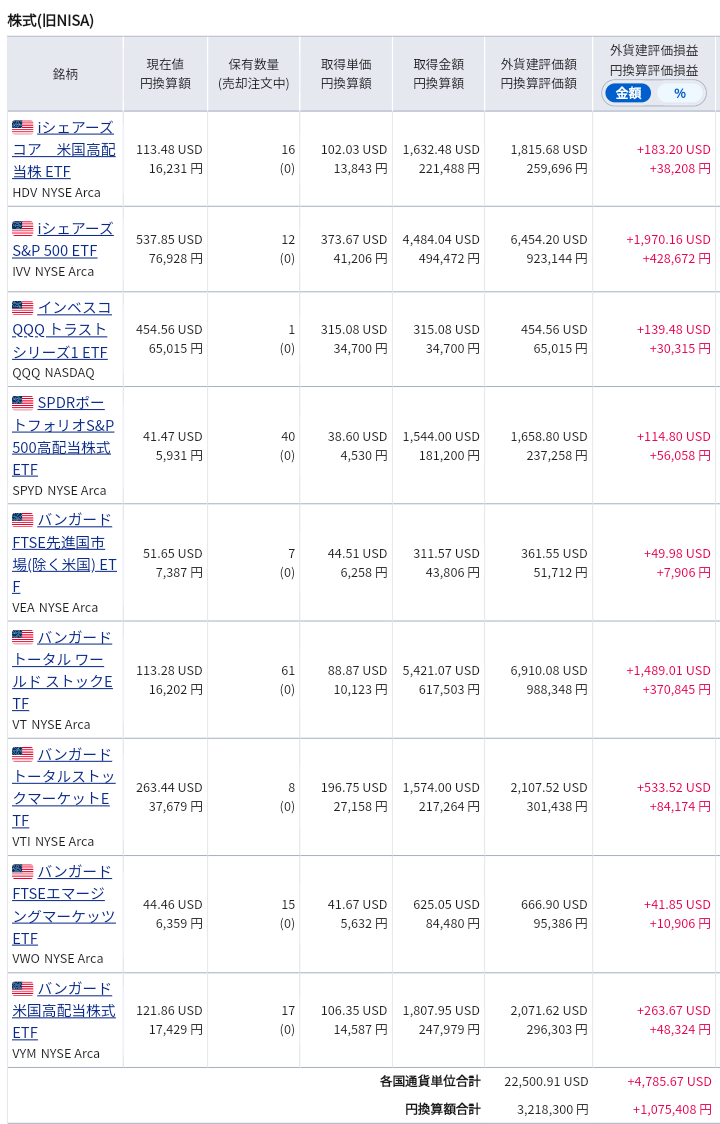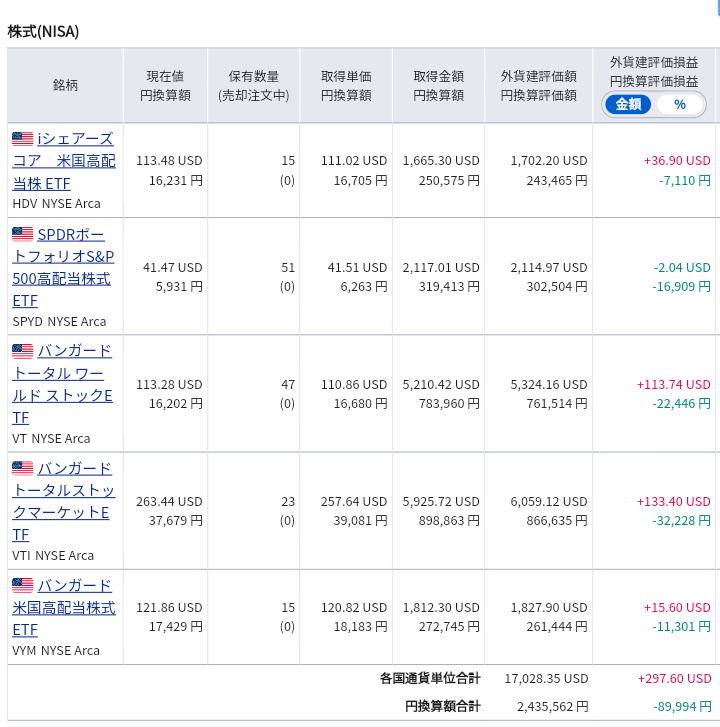 評価損益が、ドルで見た時と円換算した時の乖離が激しく、とくに現行NISAでは297.60ドルのプラスに対し、円換算すると89,994円のマイナスとなってしまいます。