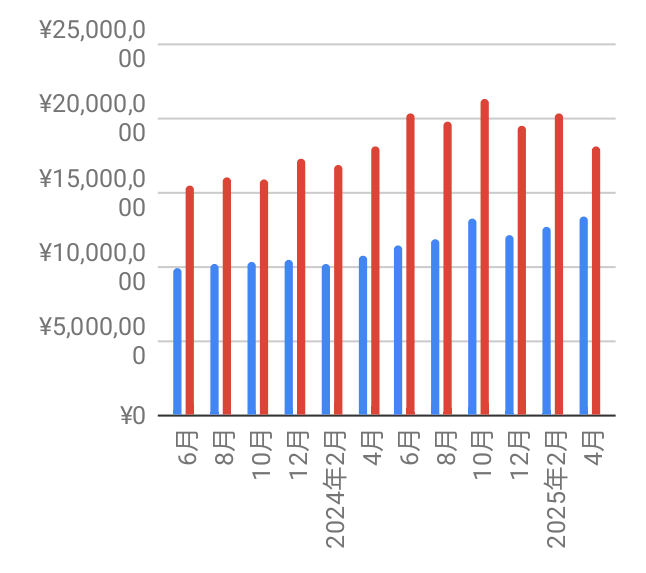 ここ2年の投資元本(青)と評価額(赤)の推移です↓
