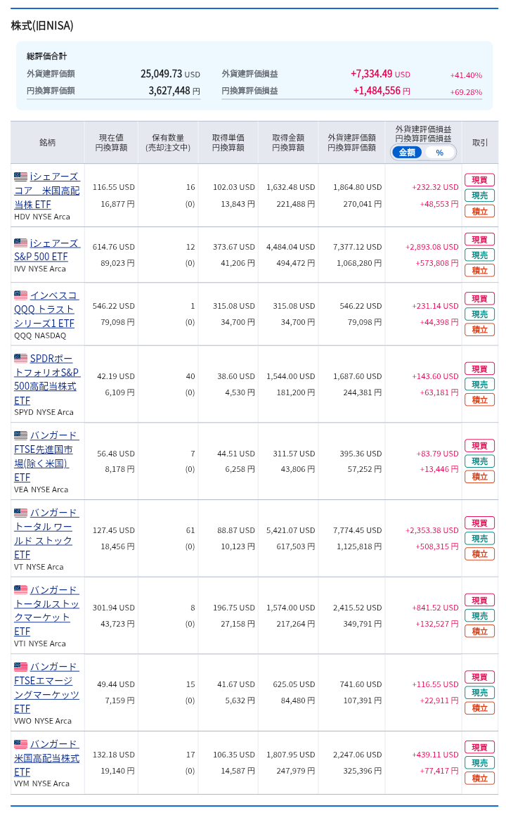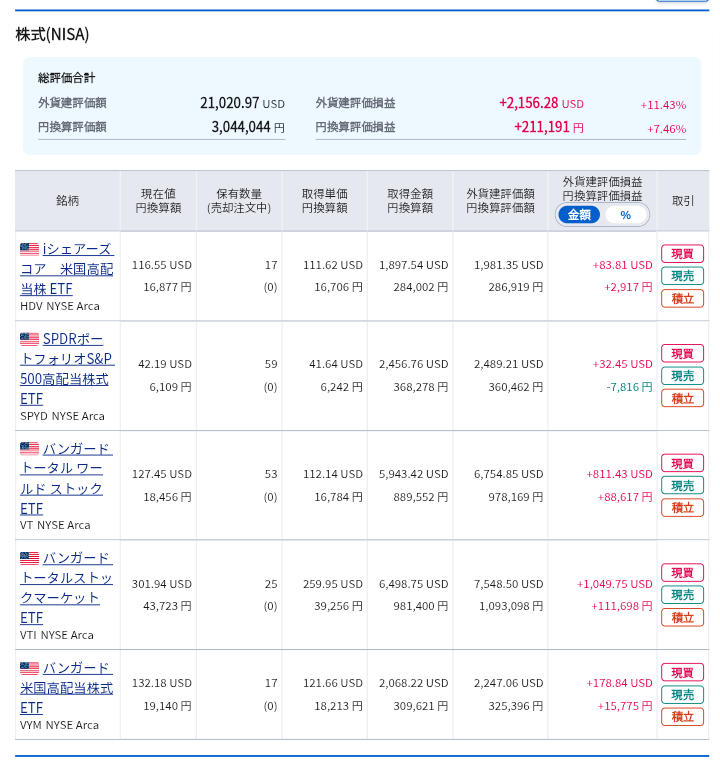 こちらも円建て部分と同様に、一般的インデックス(VT、VTI)と、高配当ETF(SPYD、VYM、HDV)の両方をコツコツ買い付けしています。