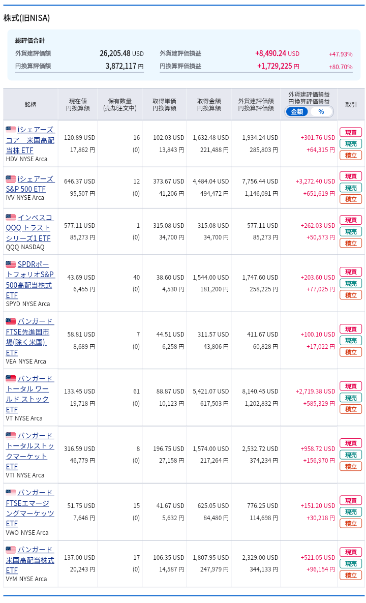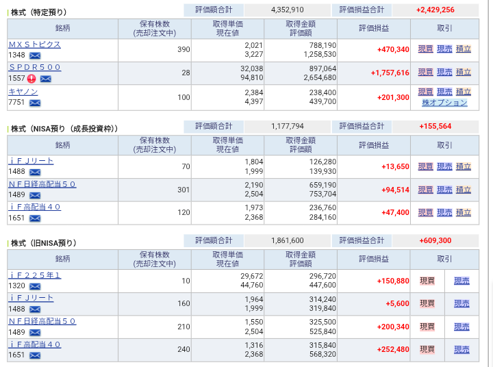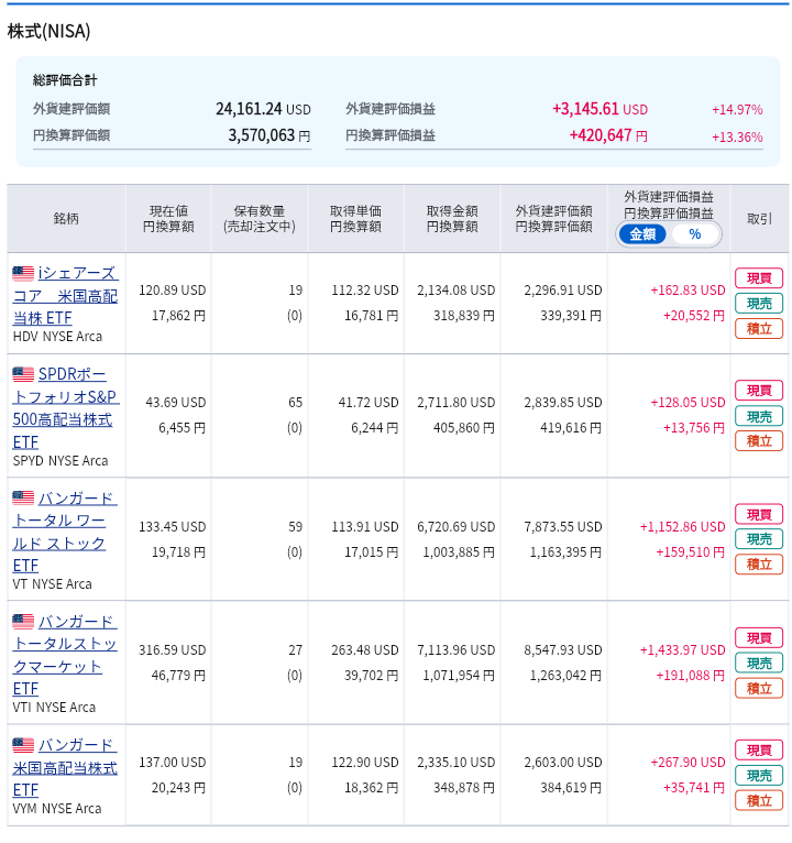 こちらでは、高配当ETFを3種と、標準的なETFを2種、それぞれ積み立てています。