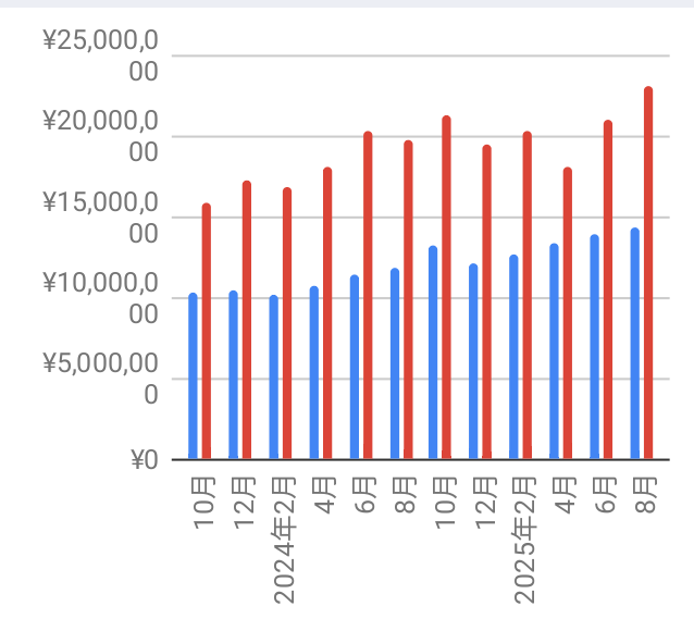 ここ2年の投資元本(青)と評価額(赤)の推移↓