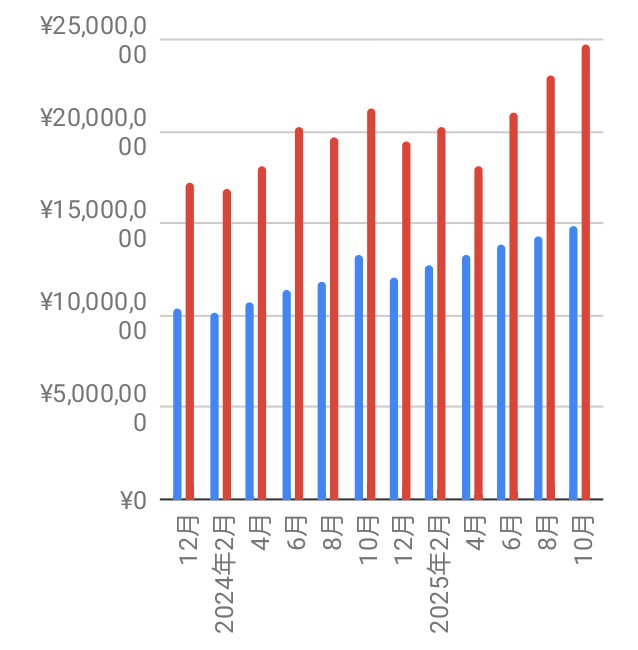 ここ2年の投資元本(青)評価額(赤)の推移↓
