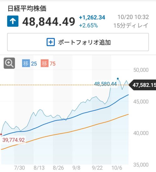 日経平均の3カ月チャートです。10月初めに大きくアップしました。